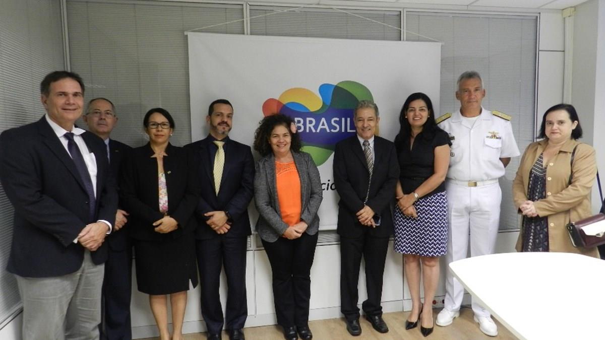 Perpétua Almeida e Marcos Sales (ao centro), do Ministério da Defesa e da Embratur, com as equipes dos órgãos