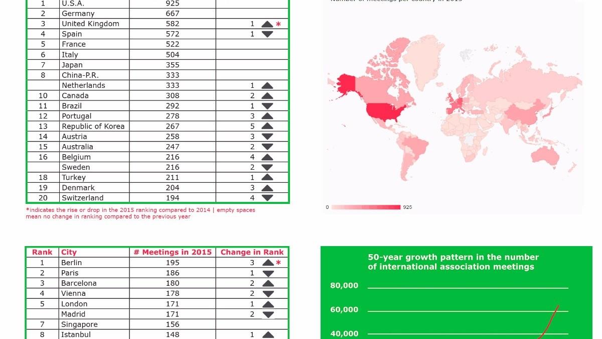 Depois de dez anos frequentando as dez primeiras posições no ranking da International Congress & Convention Association (Icca), o Brasil perdeu uma posição e foi o 11º país que mais realizou eventos e congressos internacionais em 2015, segundo ranking divulgado pela entidade nesta manha. O Brasil somou 292 eventos catalogados. Os Estados Unidos e Alemanha se mantiveram, respectivamente, em primeiro e segundo lugares, com 925 e 667 eventos internacionais. O Reino Unido passou a Espanha e agora ocupa a 3ª posição.