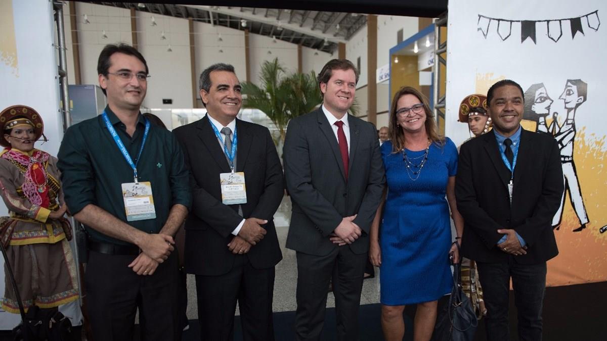 Ferdinando Lucena, diretor do Centro de Convenções de João Pessoa, Bruno Mesquita, presidente da Abav-PB, Marx Beltrão, Ministro do Turismo, Ruth Avelino, Presidente da PBTur, e Claudio Junior, diretor do Festival JPA, na edição de 2016 do evento
