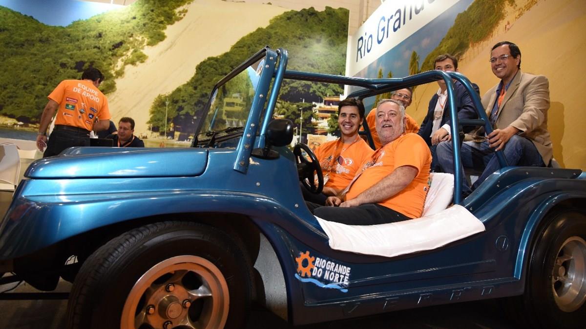 Rio Grande do Norte também inovou e trouxe um buggy. Quem busca alguns segundos de adrenalina terá à disposição um atrativo diferente no estande do Beto Carrero World. Trata-se de um simulador da Fire Whip, única montanha-russa invertida do País.