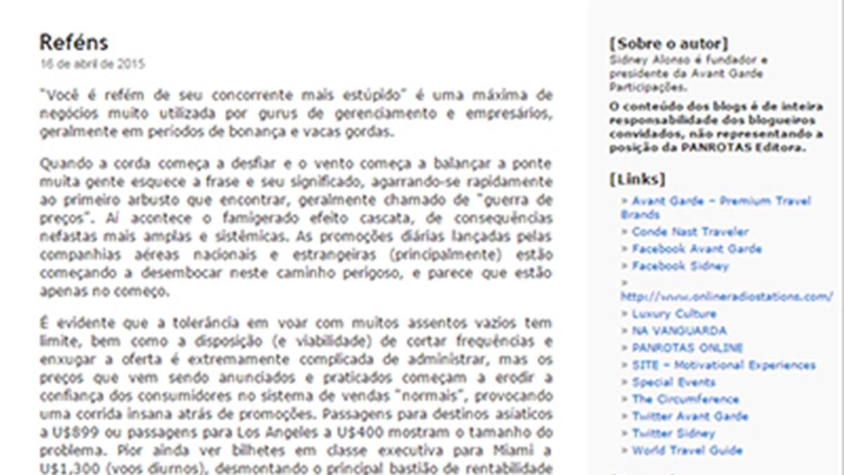 A “guerra de preços”, o excesso de assentos vazios e o corte de frequências aéreas são alguns dos assuntos discutidos por Alonso. Clique aqui para acessar o blog.