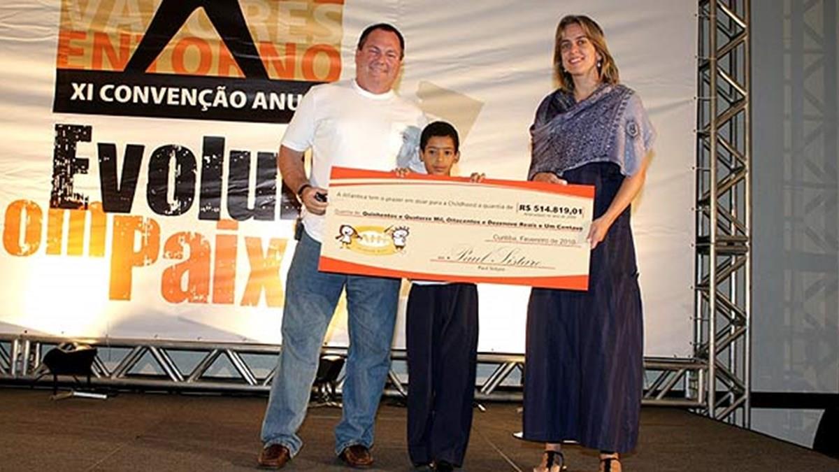 O presidente da Atlantica Hotels Internacional, Paul J. Sistare, fez entrega simbólica de cheque no valor de R$ 514.819,01 à Childhood Brasil, durante a cerimônia de abertura da 9ª Convenção Anual da companhia, no hotel Four Points by Sheraton, em Curitiba, realizada ontem pela manhã. “Graças ao esforço conjunto de nossos colaboradores, hóspedes, investidores e demais parceiros, conseguimos comemorar com a Childhood Brasil a superação de nossa meta inicial de R$ 500 mil em arrecadação em favor das ações orientadas pela instituição contra o abuso e a exploração sexual de crianças e adolescentes. Por isso, farei a entrega do cheque diante dos nossos gestores de hotéis, os principais responsáveis por essa conquista, pois eles são os grandes incentivadores de suas equipes e merecem nosso agradecimento”, diz o presidente da Atlantica Hotels.