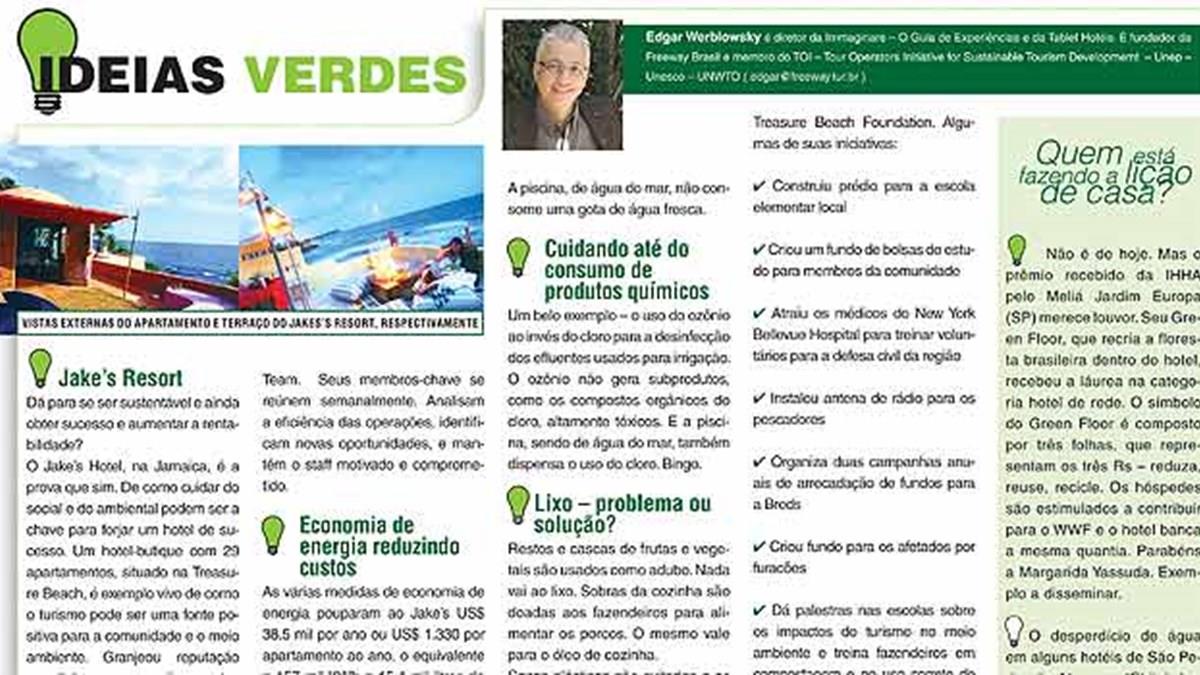 O Jake´s Hotel é a grande estrela da coluna Ideias Verdes desta semana, assinada pelo diretor da Immaginare e fundador da Freeway, Edgar Werblowsky, no Jornal PANROTAS. O empreendimento jamaicano mostra como simples ações podem gerar grandes transformações no dia a dia das pessoas. Saiba também quais as empresas estão fazendo a sua lição de casa quando o assunto é sustentabilidade. E as que não estão também. Clique aqui e leia, na íntegra, a coluna Ideias Verdes.