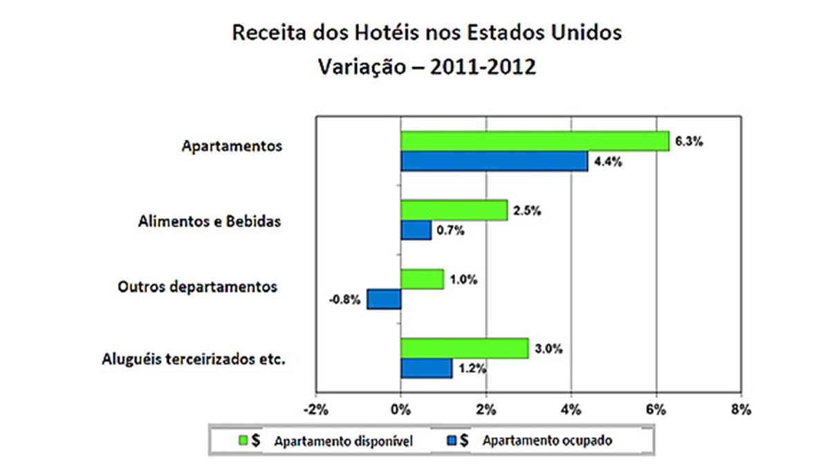 Isto significa que a receita combinada ganhou do montante gerado por A&B, por outros departamentos (telefone, internet, lavanderia, estacionamento etc.) e por aluguéis para terceiros (lojas e serviços dentro do hotel, para atividades não operadas pelo empreendimento), que aumentaram apenas 2,3% por quarto disponível ou apenas 0,5% quando medido em uma base de dólar por quarto ocupado.