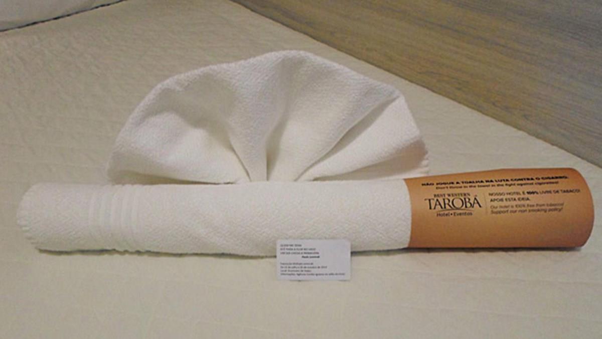 O Best Western Tarobá Hotel, em Foz do Iguaçu (PR), adota uso de esculturas feitas com toalhas de banho que imitam um cigarro gigante para incentivar os hóspedes a não fumarem nas dependências do hotel