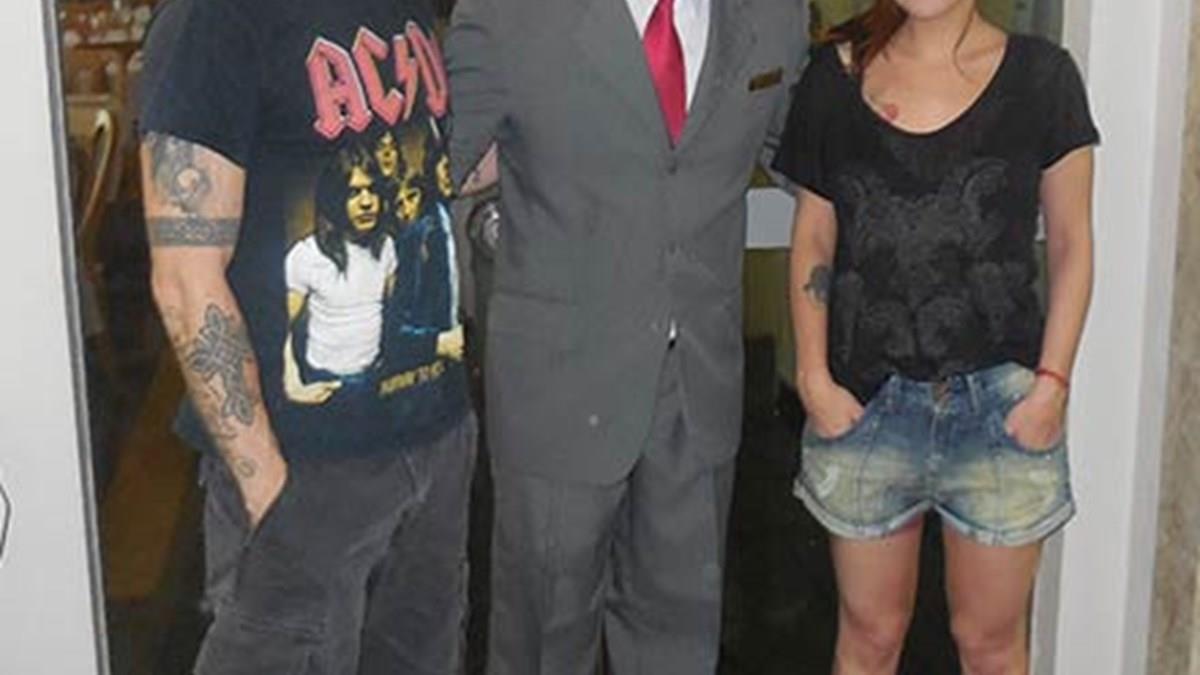 Na foto, o recepcionista Brayan Silva recebe Pitty e o guitarrista Martin Mendonça.