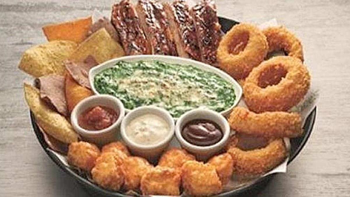 A versão generosa inclui Crunchy Onion, Mozzarella Sticks, Canoe Fries, Boneless Buffalo Wings e Popcorn Shrimp.