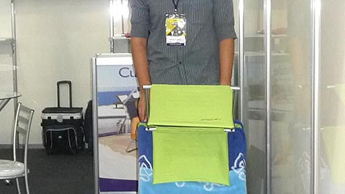A Cush’n Shade divulgou na Equipotel deste ano Telhadinho de Sol, suporte para cadeira de piscina que une sombrinha com fator de proteção ultravioleta 50+ e almofada