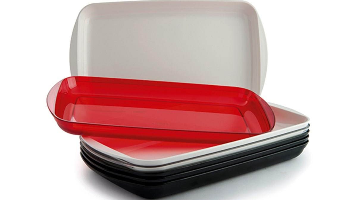 As peças são empilháveis e disponíveis em três tamanhos: duas retangulares e uma quadrada. Já as opções de cores são cristal, preta e vermelha. A novidade é uma alternativa econômica em relação às travessas de porcelana, cerâmica ou inox.