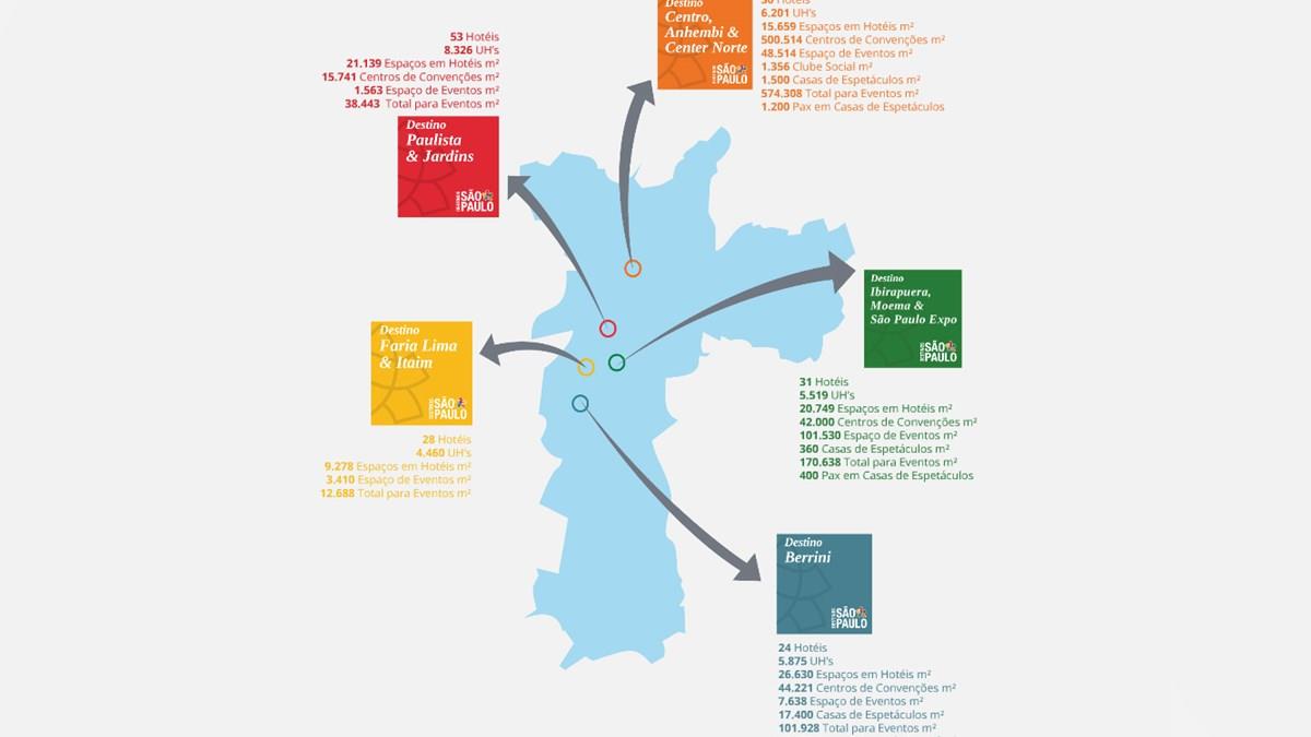 O SPCVB dividiu os hotéis e espaços de eventos por regiões a partir de cinco destinos principais. Confira abaixo as informações atualizadas de cada bloco: