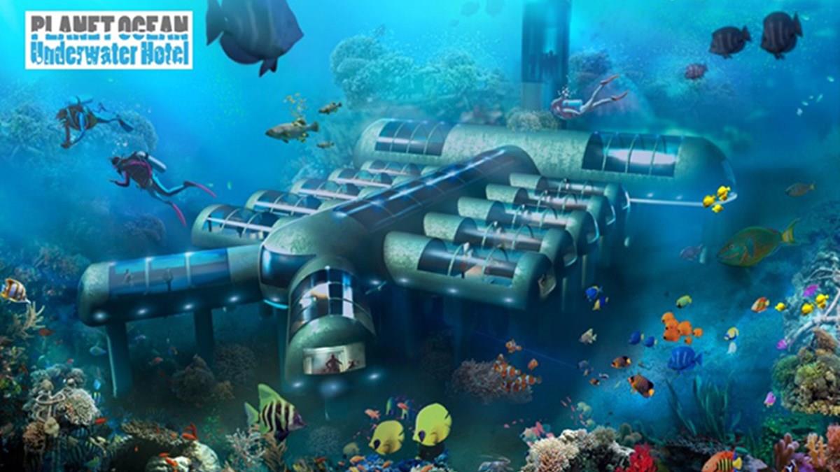 O primeiro hotel subaquático do mundo está sendo projetado em Dubai, o Planet Ocean Underwater Hotel. Situado a dez metros da superfície, o hotel tem estrutura em aço soldado de espessura dupla e sua montagem é muito parecida com a de uma Estação Espacial Internacional.