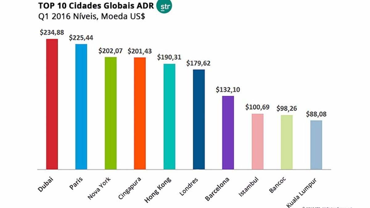 Estudo da STR mostra que, nos três primeiros meses do ano, a maior diária média hoteleira mundial foi registrada em Dubai, nos Emirados Árabes Unidos: US$ 234,88. Houve uma queda de 10% em relação ao ano passado, mas Dubai lidera esse ranking há 12 anos seguidos. Apenas três outros mercados pesquis