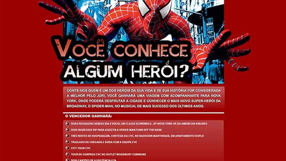 E o encontro com um herói da ficção se dará no musical de maior sucesso da Broadway atualmente — Spider Man: Turn Off The Dark. Os vencedores levam, cada um, dois ingressos vips, com possibilidade de visitar os bastidores. Os cartões de assistência serão oferecidos pela GTA.