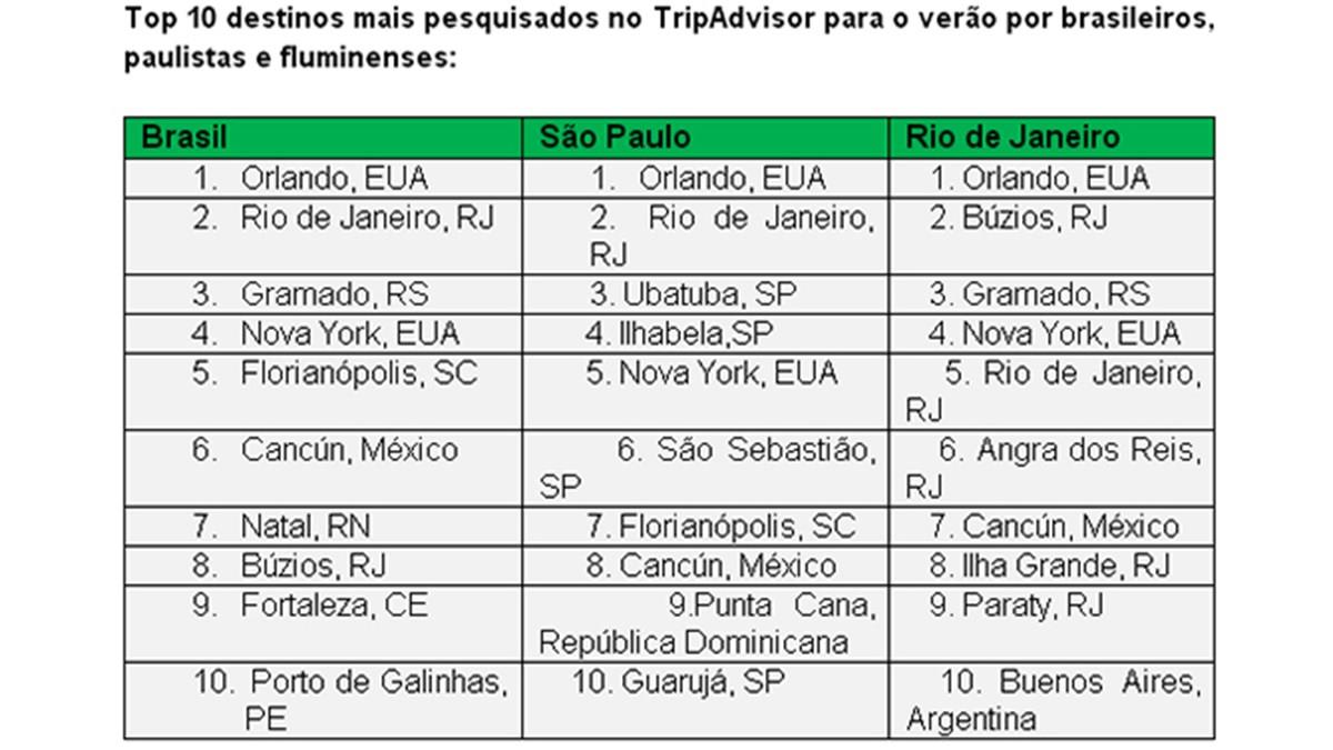 Confira na tabela acima os dez destinos mais procurados.