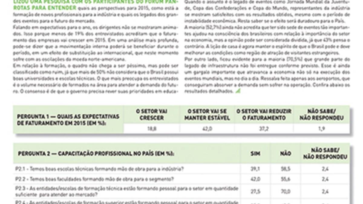 A PANROTAS Editora, com o apoio da Confederação Nacional do Comércio de Bens, Serviços e Turismo (CNC), realizou uma pesquisa com os inscritos no Fórum PANROTAS (mais de 20% responderam) para entender quais as perspectivas para 2015, como está a formação de novos profissionais para a indústria e quais os legados dos grandes eventos para o futuro do mercado.