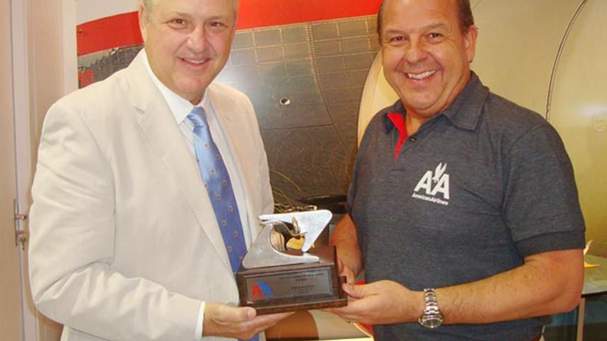 Em homenagem aos 20 anos de operações da American Airlines no Brasil, a Aviesp entregou um troféu especial à aérea norte-americana, entregue pelo presidente da entidade, William Périco, ao diretor de Vendas da companhia, José Roberto Trinca.