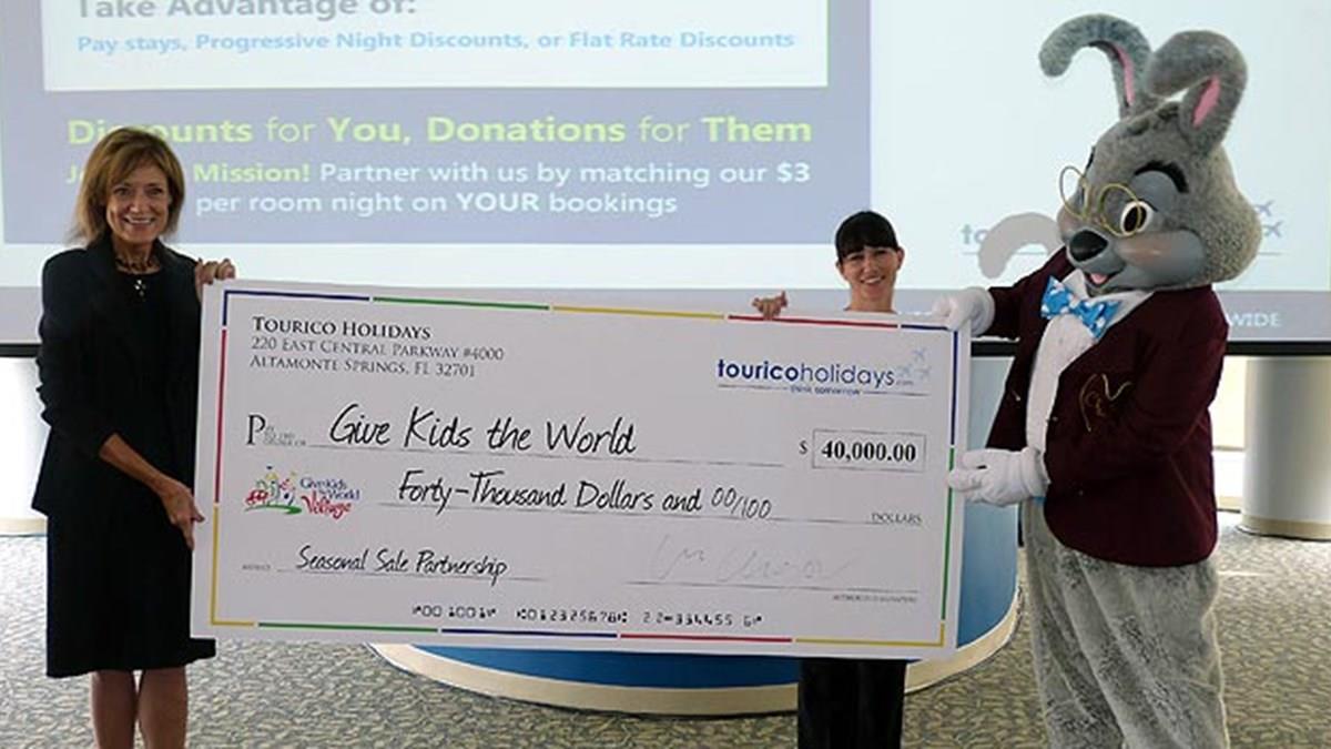 Com sua sede na região de Orlando, mais precisamente em Altamonte Springs, a Tourico Holidays é uma das empresas que colabora em bases regulares com a Give Kids the World. Durante a "The 100 Club Summit" da Tourico, que aconteceu essa semana no Hilton Lake Buena Vista, no Walt Disney World, a vice-presidente de Marketing da empresa, Lauren Volcheff, entregou à presidente da GKTW, Pamela Landwirth, um cheque de US$ 40 mil da última campanha realizada pela empresa.