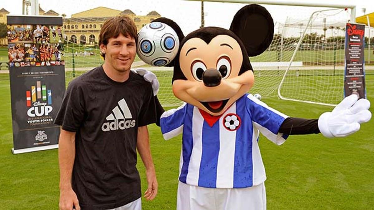 Messi, que joga no time do Barcelona, na Espanha, fez uma demonstração de suas habilidades aos participantes da Copa e foi recebido, no Wide World of Sports, por Mickey Mouse, também com seu uniforme de futebol.