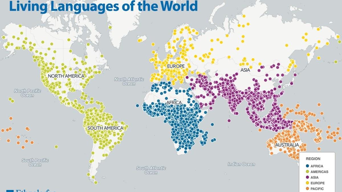 Além do ranking de países multilinguísticos, o catálogo também aponta que as línguas estão distribuídas de forma desigual em todo o mundo. A maioria das línguas está concentrada na África e na Ásia. O menor número, por sua vez, pertence à região da Europa. Em números precisos, 32,4% das línguas se encontram na Ásia; 30,1% na África; 18,5% no Pacífico; 15% nas Américas; e 4% na Europa. No mapa a seguir, é possível ter uma dimensão de como as línguas estão espalhadas pelo mundo.