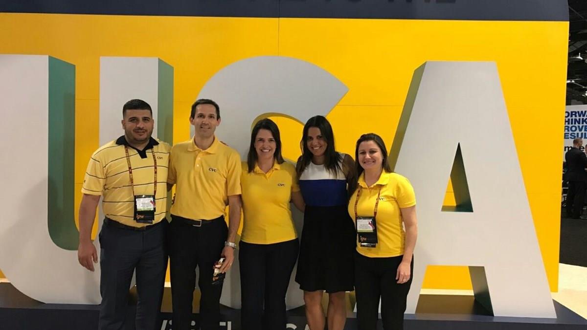 No IPW 2017, em Washington DC, o gerente sênior de Produtos para as Américas da CVC, Rodrigo Vaz, esteve acompanhado de dois gerentes de Produtos e dois negociadores, que ficam nos Estados Unidos. Abe Salam é o negociador em Nova York e Janaina Tognoli em Orlando, ambos com a função de negociar hotéis localmente. Na foto acima, Vaz está com Abe e Janaina e com as gerentes Fernanda Paranhos (Flórida) e Melissa Rosa (EUA e Canadá).