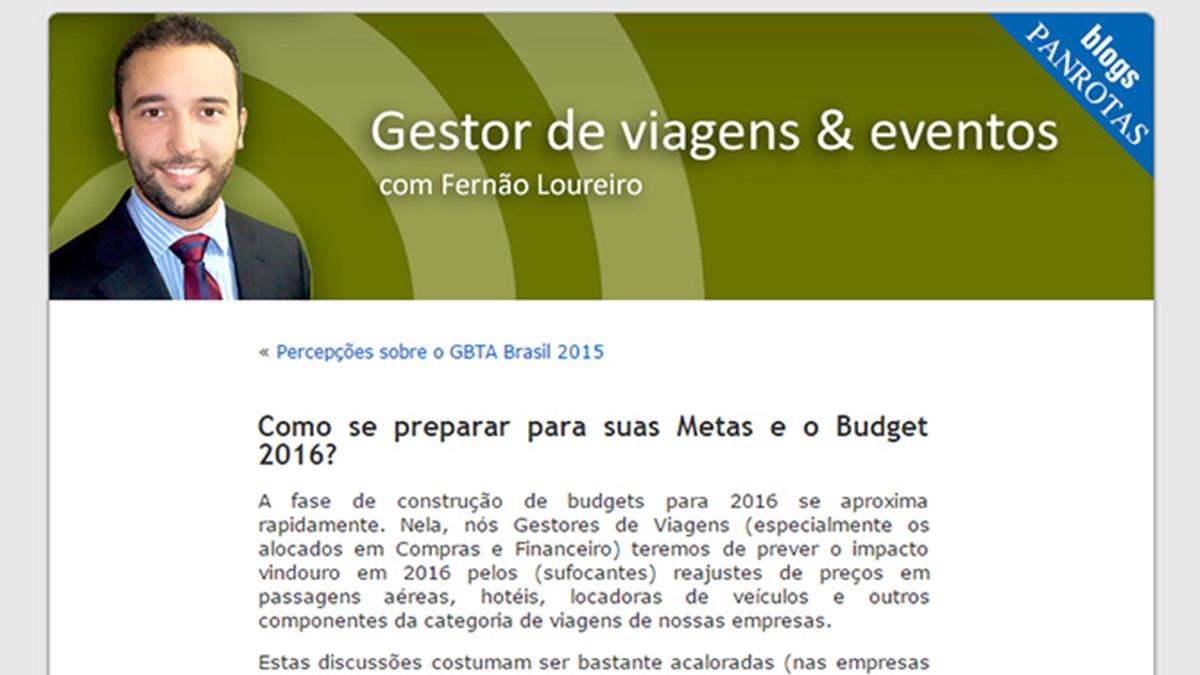 Fernão Loureiro, que assina aqui no Portal PANROTAS o conteúdo do blog “Gestor de viagens e eventos”, refletiu em seu mais recente post sobre a fase de construção de budgets para 2016. Segundo ele, nesta etapa os gestores de viagens deverão prever o impacto em 2016 pelos reajustes de preços de passagens aéreas, hotéis, locadoras de automóveis e outros componentes da cadeia turística.
