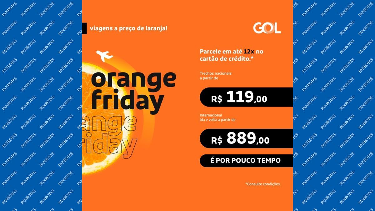 A Gol deu início a Orange Friday de 2024, que vai até domingo, 1º de dezembro, às 23h59. Nos quatro dias, a companhia vai oferecer trechos nacionais a partir de R$ 119 e viagens internacionais de ida e volta, a partir de R$ 889.
