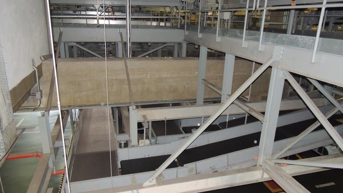 Já no andar do pátio das aeronaves, se trata de uma longa esteira próxima do teto de um galpão, que passa sobre uma série de esteiras menores, uma para cada aérea. Scanners 3D identificam para que companhia a bagagem vai; assim, ao passar por cima da aérea específica, a mala cai em um tipo de funil, que termina nos funcionários da empresa.