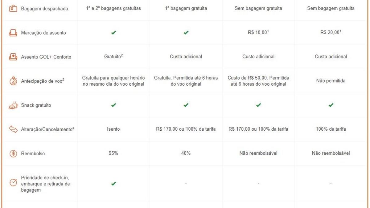 Outra mudança é que clientes Promo não poderão antecipar voos, enquanto clientes Light têm de desembolsar R$ 50 para tal benefício, desde que seja dentro de seis horas antes do embarque. As outras categorias estão isentas dessa cobrança, podendo antecipar gratuitamente dentro das seis horas.