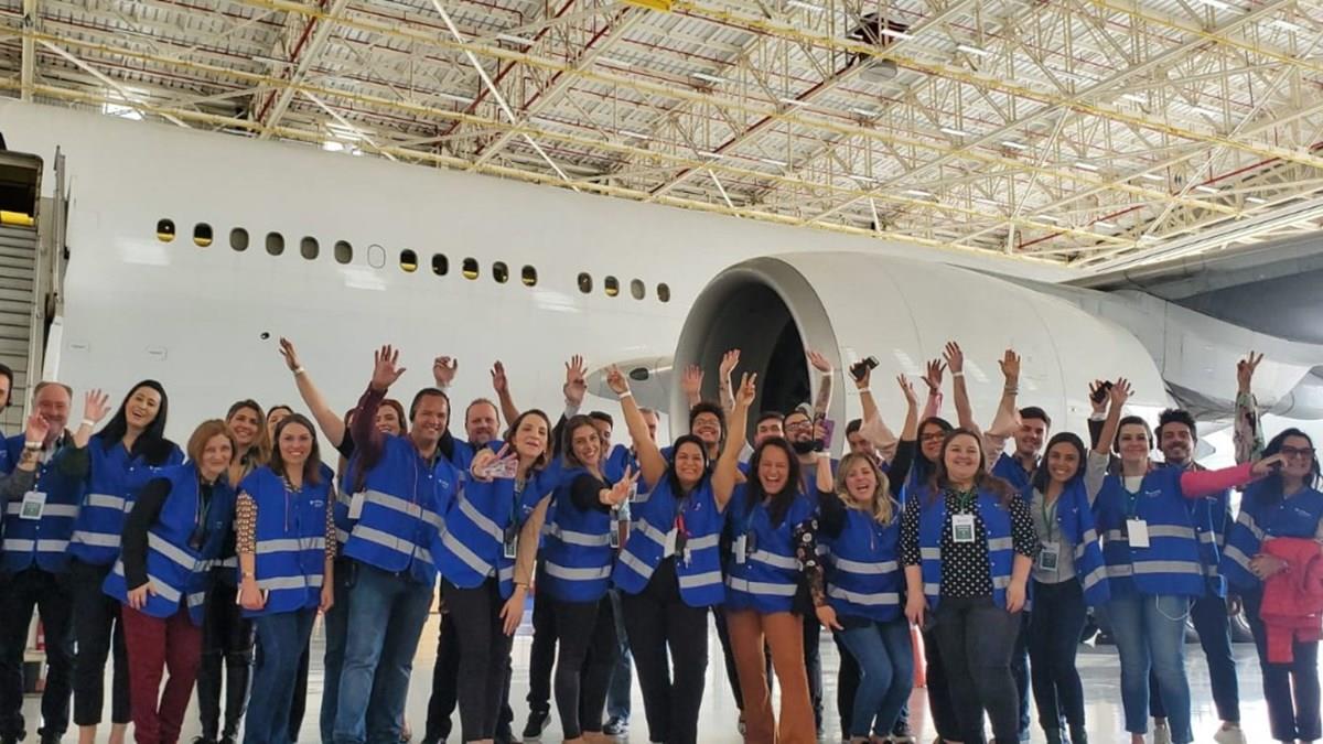 A Latam Brasil levou representantes de empresas parceiras para conhecer a nova cabine remodelada de suas aeronaves Boeing 777 no Centro de Manutenção de Linha