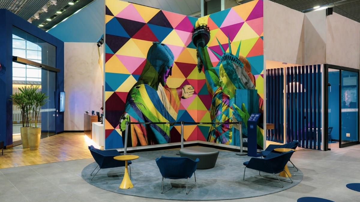 O lounge já chama atenção pelo visual exibindo uma obra de arte criada pelo muralista brasileiro Eduardo Kobra, feita especialmente para o espaço. A obra, de 27 metros quadrados, representa a presença global da marca, com foco criativo em viagens e integração cultural, destacando destinos turísticos importantes do Brasil e dos Estados Unidos, ambos mercados relevantes para a American Express.