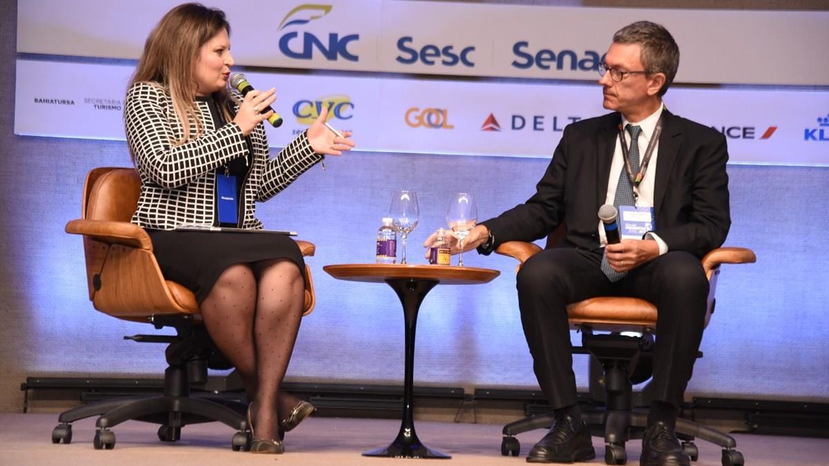 A jornalista especialista em economia e política Joice Hasselmann entrevistou o economista-chefe do Banco Safra, Carlos Kawall, no palco do Fórum PANROTAS.