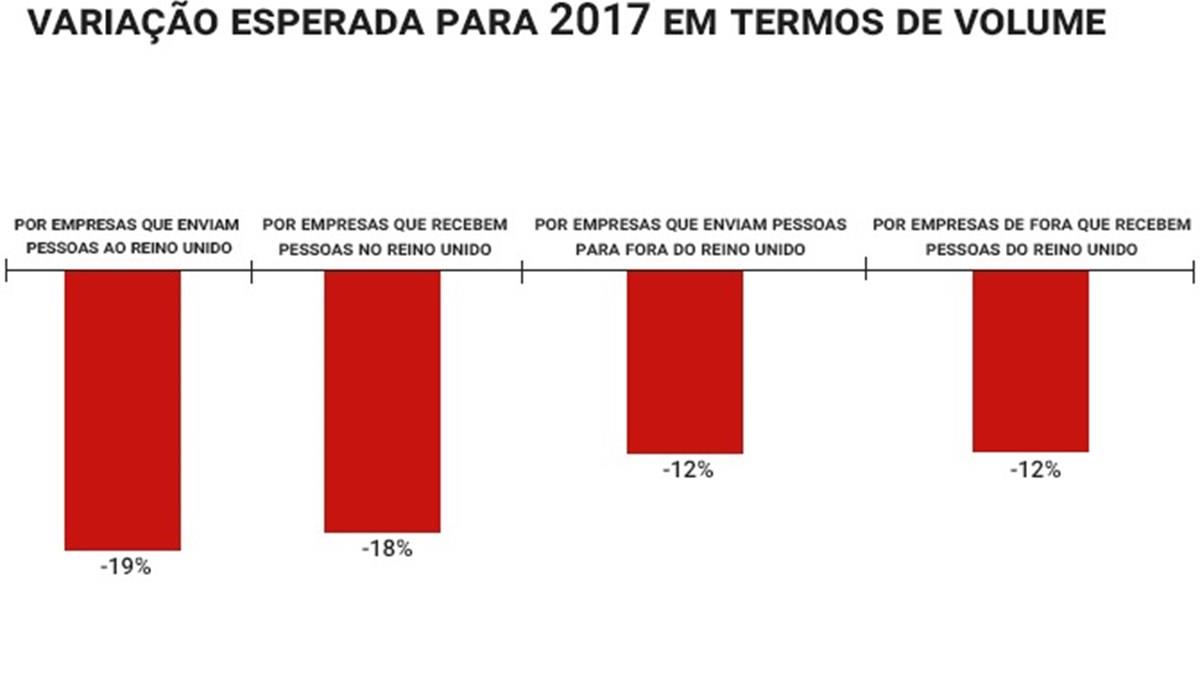O pessimismo se traduz em quedas previstas na casa dos dois dígitos. Empresas que enviam pessoas ao Reino Unido esperam uma retração de 19% - enquanto os negócios relacionados à vinda de britânicos devam cair 18%.