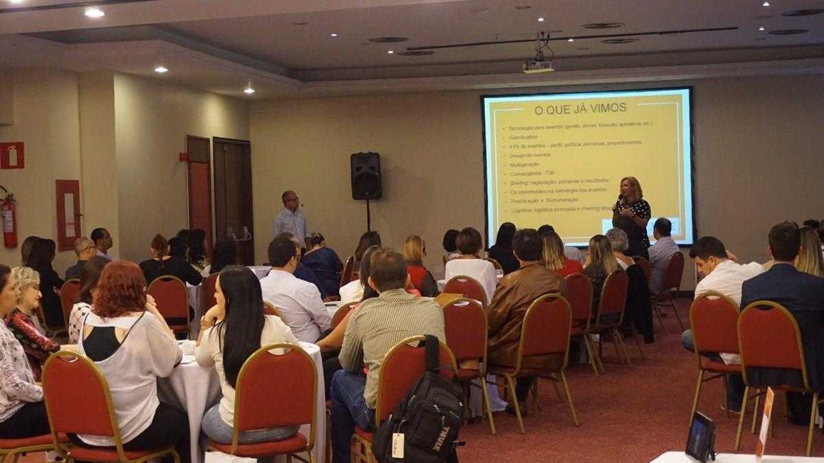 A sócia-diretora da Academia de Viagens Corporativas, Viviânne Martins, e o consultor José Marques, conduziram o workshop sobre as últimas vertentes do mercado de Mice, com tópicos como tecnologia e seus desafios, gestão de risco, wellness em eventos e strategic meeting management.