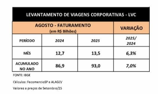 O valor acumulado no decorrer dos oito primeiros meses de 2025 também atingiu uma marca histórica. O estudo aponta que as viagens a negócios somaram R$ 93 bilhões neste período. Este valor é 7% superior ao registrado no mesmo período de 2024, que foi de R$ 86,9 bilhões.