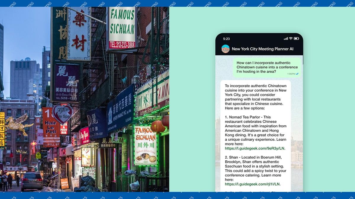 Os usuários podem fazer perguntas à Ellis como “Qual é a sala com uma vista fantástica do skyline que posso alugar para uma reunião com 50 pessoas?” ou “Como posso incorporar a culinária autêntica de Chinatown em uma conferência que estou organizando na região?” e receber respostas instantâneas e detalhadas.
